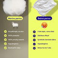 - Hypoalergénna a prémiová kvalita - Nie každá Merino vlna je rovnaká. My používame iba vlákna tej najvyššej triedy – mimoriadne jemné, hebké a šetrné k pokožke, ktoré nepichajú ani neprenikajú cez poťah. Zároveň sú výnimočne odolné, takže si zachovajú svoj tvar, vzhľad aj komfortný pocit dlhé roky.